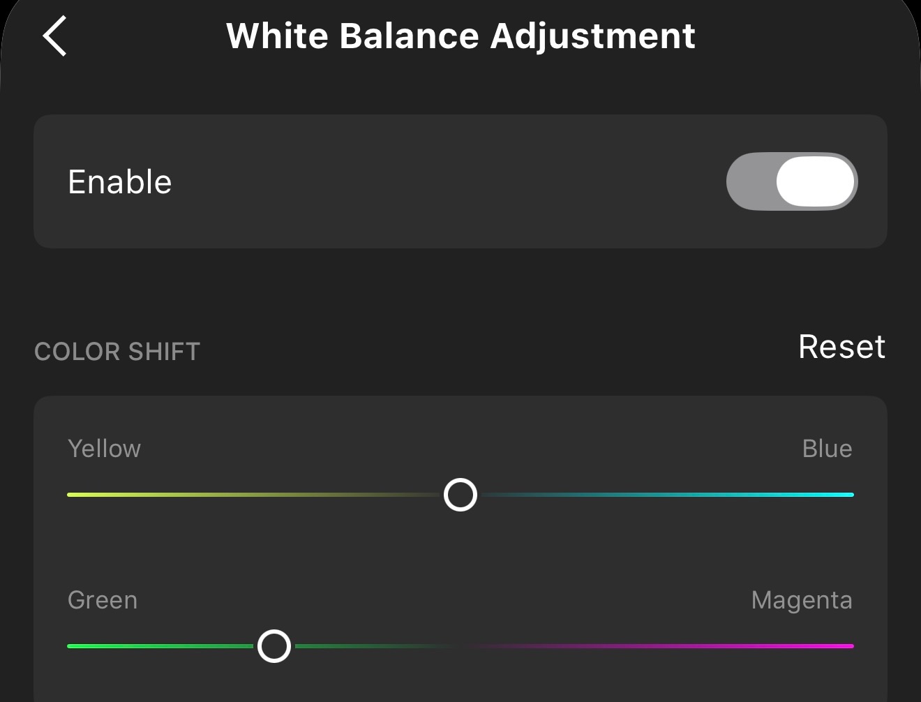 Choosing the second option with the first switched on allows you to move between green and magenta on the vertical axis and yellow and blue on the horizontal (reflecting the Tint option in Lightroom). You can use the touchscreen to move the sliders and a double tap centres it again.